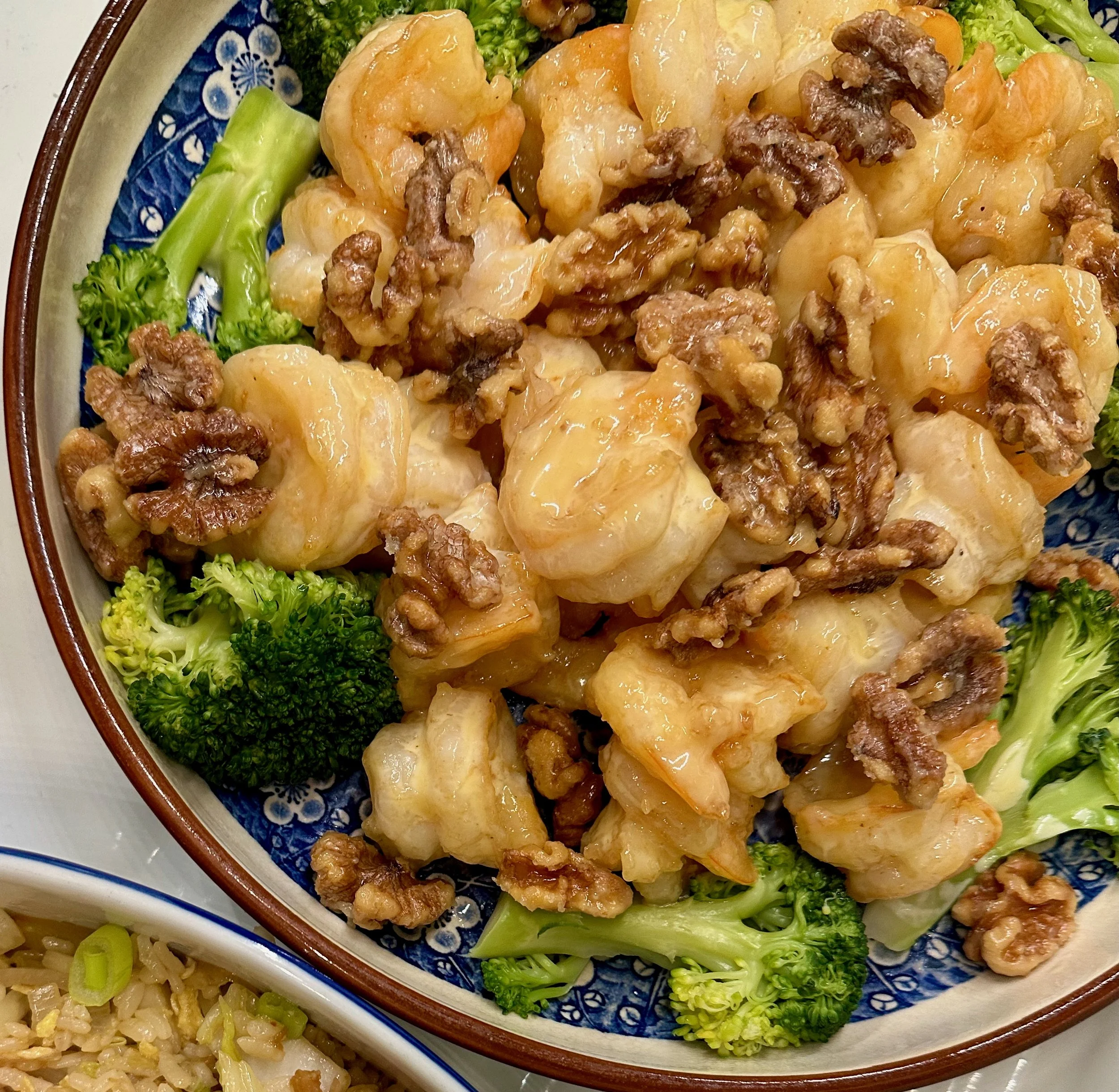 Cantonese American classic featuring crisp fried shrimp in sweet and savory sauce, served with candied walnuts and broccoli