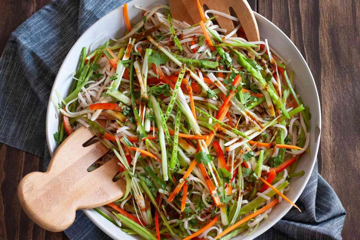 Rice vermicelli with matchstick cucumber, carrot, bell pepper, local lettuces, fresh herbs, crushed peanuts and sweet and savory lime and fish sauce dressing
